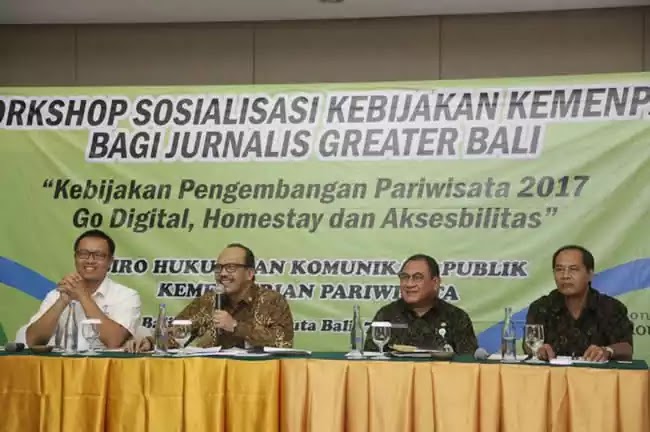 Mata acaranya, “Workshop Sosialisasi Kebijakan Kemenpar bagi Jurnalis Greater Bali” yang berlangsung di Bali Rani Hotel Kuta, Bali, Jumat (7/4). Temanya: "Kebijakan Pengembangan Pariwisata 2017: Go Digital, Homestay, dan Aksesibilitas” Host-nya adalah Biro Hukum dan Komunikasi Publik Kemenpar. Adapun narasumber yang akan tampil di forum bersama komunitas media itu adalah Sekretaris Kementerian Pariwisata (Sesmenpar), Ukus Kuswara ; Staf Ahli Direksi Indonesia Tourism Development Corporation (ITDC), Ida Bagus Abdi; Sta Khusus Menteri Bidang Komunikasi dan Media, M. Noer Sadono; dan Kepala Dinas Pariwisata Provinsi Bali, Anak Agung Gede Yuniartha.
